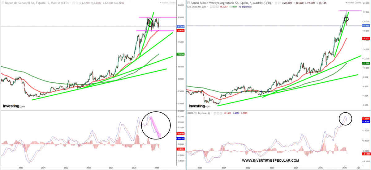 Ahora mismo vemos más riesgo que rentabilidades a corto plazo. Observen MACD en Sabadell divergiendo a la baja y en el BBVA cortado a la baja a un nivel nunca visto de alto.