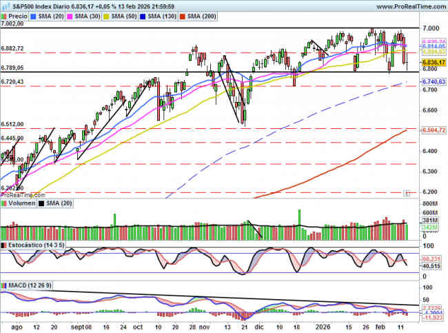 Por debajo el soporte critico situado en 6789 lo ha respetado, si fuese perforado es probable que la caída se acelere con objetivo 6720 y posteriormente 6512 puntos.