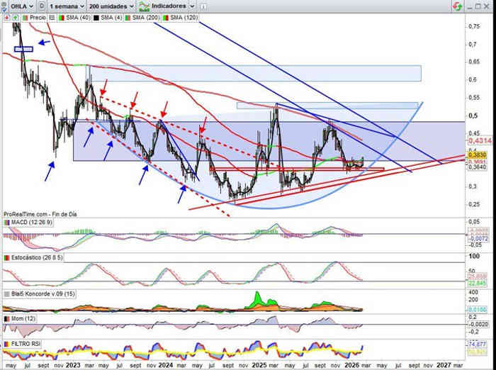Sobre Gráfico Semanal comienza la semana perforando la resistencia clave inmediata, tiene muy buena estructura técnica, me gusta, pero hay que esperar confirmativos de esta perforación de resistencia clave que a cierre semanal señalaría posiblemente fin de movimiento de consolidación desde los máximos recientes por zona 0,82€ / 0,83€, que sobre Gráfico Semanal no sería su primera zona clave en proyección desde actual zona, habría en el camino una primera zona relevante como tal por los 0,75€, en todo caso una directriz techo de Canal Alcista superpuesto sobre la estructura de fondo que me parece actualmente de gran potencial. Indicadores entrando ya en favor de la tendencia, y punto de inflexión compra sobre el indicador MACD.