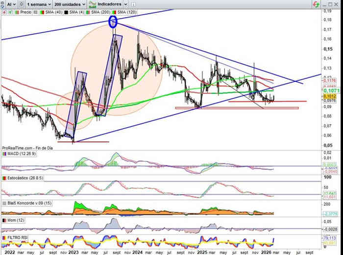 Vamos a ver esta semana si con fuerza para algo más hacia la zona de los 0,1090€, a partir de la cual empezaría a activar señales de relanzamiento alcista para probar las directrices bajistas clave.