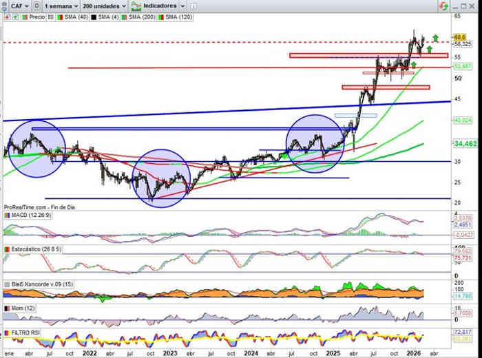 Sobre Gráfico Mensual, con indicadores en señal compra y en favor de la tendencia y pendientes de cierre de Mes, bastaría en esta vista cierre en cuerpo de vela por encima de la cota de los 59€ para señalar nuevos máximos históricos en este sentido y de esta manera activar proyección mayor hacia la siguiente zona objetivo por los 68,50€.