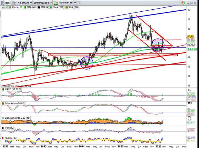 Por tanto deberes para esta semana la perforación a cierre de esta semana, que desde la zona soporte actual 15,85€ tiene sentido, aunque en caso de confirmarse, posteriores apoyos sobre esta zona soporte fuesen necesarios como el habitual THROWBACK a zona clave de proyección estructural mayor alcista hacia sus máximos históricos.