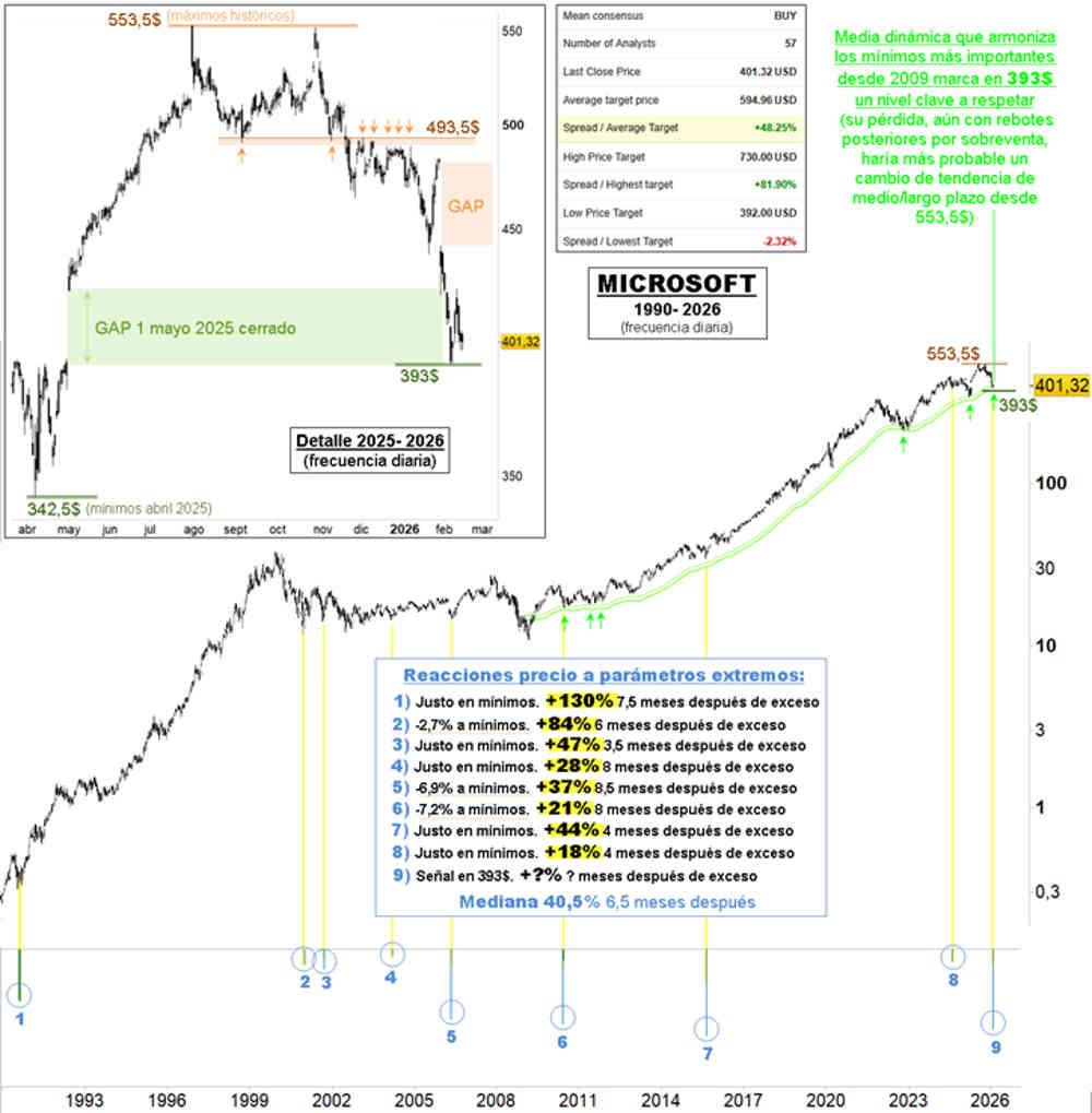 Coherente con el análisis del viernes pasado “¡Qué valiosa pista para las bolsas nos está dando el SOFTWARE!”, Microsoft, la tercera por capitalización del SP500 muestra parámetros asociados a zonas históricamente rentables de compra.