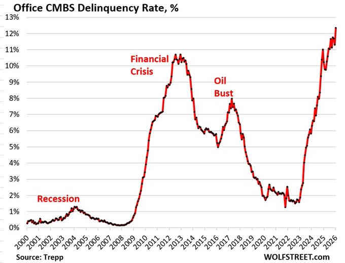 La morosidad en el sector inmobiliario comercial está por las nubes, la de los activos con garantía hipotecaria «Commercial Mortgage-Backed Securities -CMBS- para oficinas escaló otros +103 puntos básicos en enero alcanzando nuevo récord histórico del 12.3% y superando el pico máximo alcanzado en la crisis Subprime en 2008.