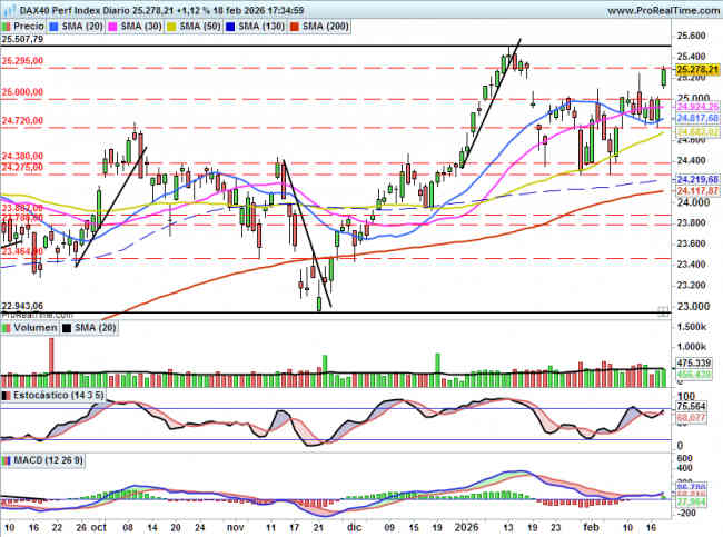 • DAX: Supera la resistencia clave de los 25100 puntos 19 febrero 2026