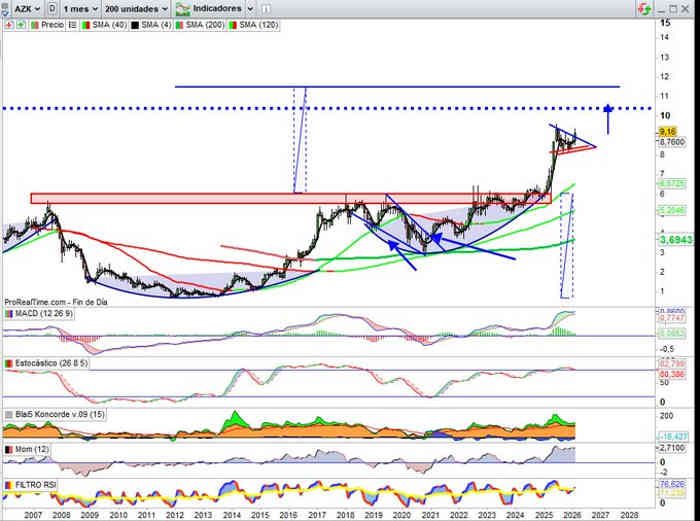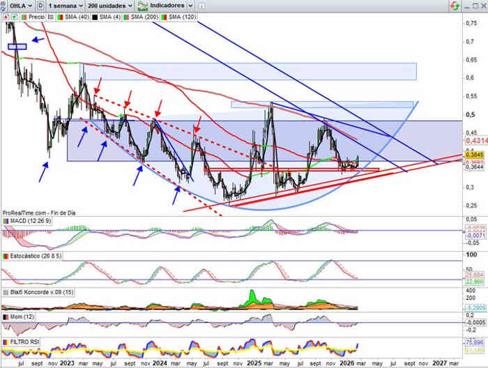 Pendientes de la sesión de hoy como cierre semanal, una jornada muy interesante para ver donde cierre este valor, pero avanzando según lo previsto, cierres de semana por encima de los 0,3750€ / 0,3650€, ya señalados como clave, en la referencia de la Media Móvil 120 en esta vista gráfica semanal, sería una muy buena señal de continuidad alcista para proyectarse en la gestión de las principales referencias resistencias, que son la doble directriz bajista cuya gestión en perforación sería una importantísima señal de cambio de tendencia, la volatilidad seguirá siendo un factor a tener en cuenta, de momento actualmente a favor de la tendencia de corto plazo, paso a paso, los indicadores en punto de inflexión alcista.
