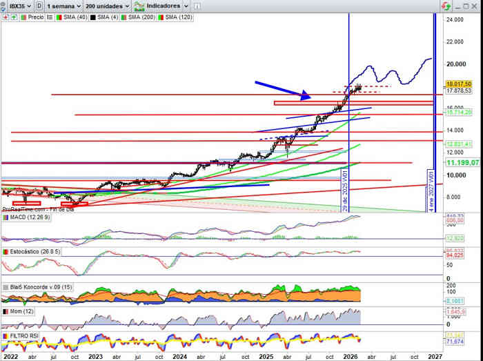 Sobre Gráfico Semanal, con indicadores en señal compra y en favor de la tendencia de momento estos parecen relajar de manera muy controlada para seguir subiendo, tenemos un lateral inmediato sobre el que puede consolidar entre referencias soporte zona 17.500 Puntos e incluso hasta zona 17.300 Puntos que hasta resistencia zona 18.050 Puntos mantiene todo en orden técnico en lateral de consolidación.