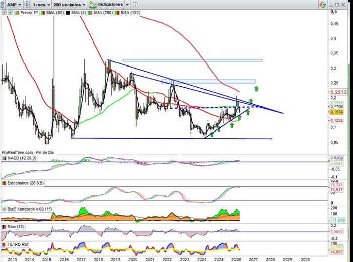 De momento en jornadas de vigilancia de soportes clave, zona 15€ supone la zona inicial soporte comentada en actualización del fin de semana y anteriores, si la pierde, le queda la tendencia alcista, en principio los recortes hasta ahora pese a las pronunciadas caídas, todo normal del lado técnico estructural.