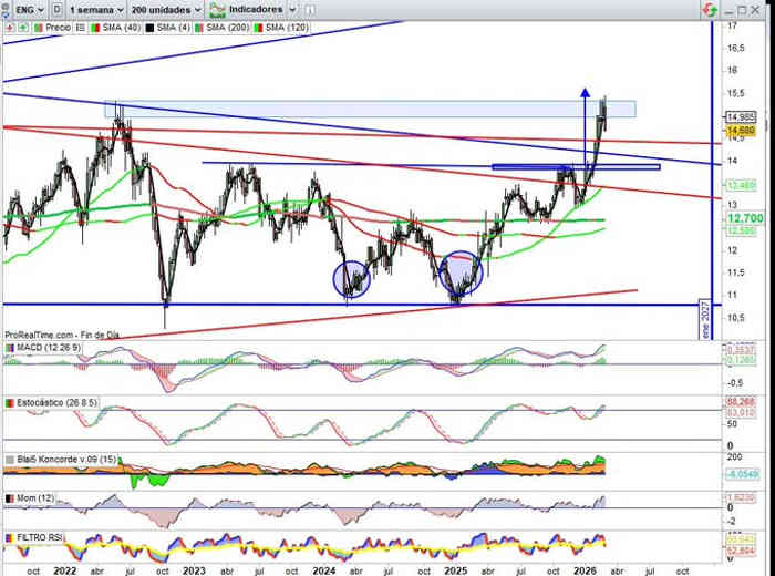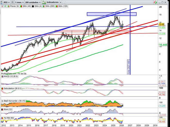 Y también importante sobre Gráfico Trimestral, porque la vela de momento es de una revalorización en el trimestre del 11,63% y de momento se mantiene por encima de la zona soporte clave inmediata, referenciada en esta vista en la zona rango 14,50€ / 14,20€, hasta la directriz soporte superior de la Doble Directriz contemplada. Sigue en buenos indicadores de señal compra y en favor de la tendencia.