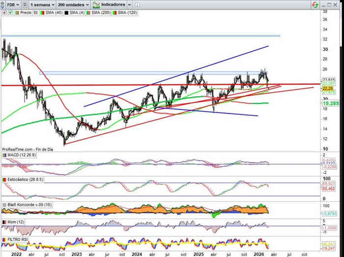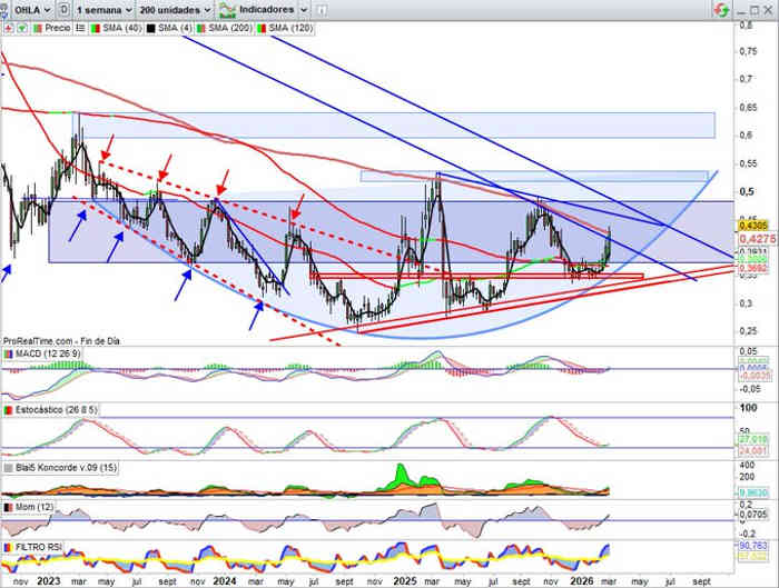 De momento sobre Gráfico Semanal se traduce técnicamente pendientes de cierre semanal en rechazo de la zona resistencia clave a confirmar como soporte, no lo consigue pese a haber cerrado semana pasada justo en el límite superior del rango comentado, y nuevamente pendientes de referencias soporte para seguir intentándolo. Sigue con buenos indicadores en semanal.