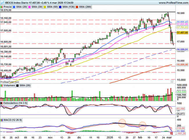 En caso de NO superar 17500 puntos al cierre el riesgo de volver a visitar mínimos en 16900 puntos es una posibilidad.