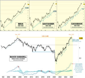 Banco Sabadell (SAB:MC) se encuentra entre dos puntos clave de medio plazo. Por arriba, presenta en los máximos de 2007 y 2025 su resistencia clave entre 3,35 y 3,48 euros. Por abajo, entre 2,5 y 2,75 euros transcurre el paso de la directriz alcista principal desde los mínimos de 2020, cuya pérdida arrastraría a un […]