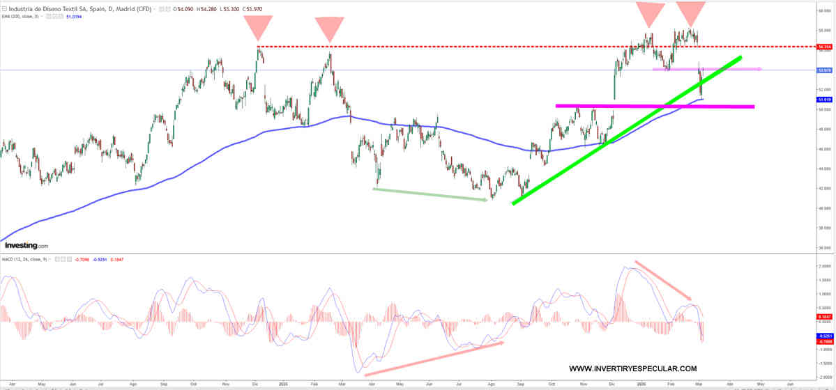 Por arriba un doble techo con divergencia bajista impone en Inditex (ITX:MC), cierto, pero tras la corrección de esta semana apoyando en los máximos de octubre y noviembre y justo en la EMA 200 al tick pues ha demostrado esa fuerza que siempre pedimos a los valores cuando bajan para certificar su calidad alcista de fondo; y lo ha hecho.