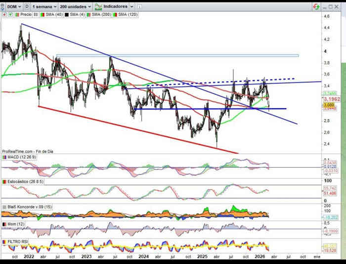 3,08€, -3,14% esta semana, negativo. Pero es uno de los que esta semana complicada más me ha gustado en reacción desde la zona soporte referenciada, sobre Gráfico Semanal los mínimos de la semana probaron la directriz bajista perforada, en su momento resistencia clave, ahora lo es como soporte, pasaría esta próxima semana por la zona de los 2,92€, pero el cierre de la semana ya terminada deja el valor por encima en esa recuperación de la zona soporte todavía de los 3€.