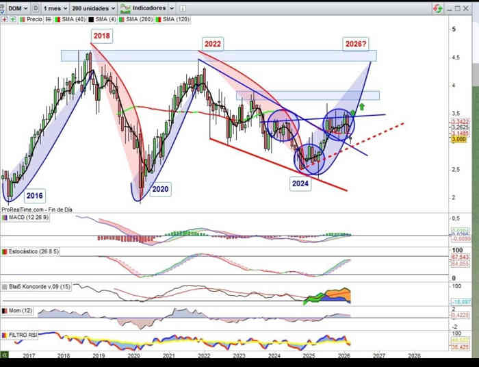 Sobre Gráfico Mensual, la opción de entrada en el valor sería en relación a lo planteado en anterior vista sobre Gráfico Semanal si el valor recupera el rango señalado, en esta vista Mensual, en el rango entre los 3,40€ y 4€ podría empezar bajo mi punto de vista a ser interesante.
