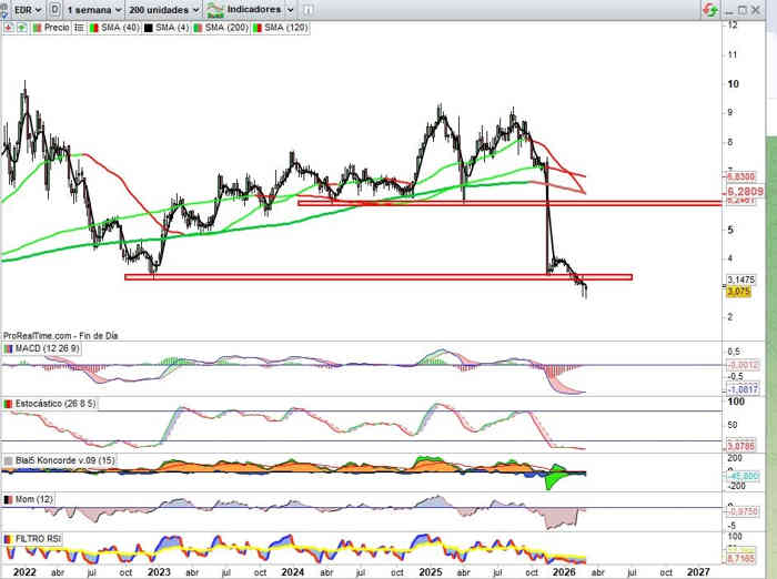 Indicadores en señal de compra pero en todo caso comprometidos como para un rebote, ahora mismo en lo que pensamos más que en rebotes es como decía en el general de los mercados en contención de las caídas. Por arriba ahora en todo caso la zona clave si se produjesen noticias positivas de mercado, la zona de los 3,20€ actualmente, un lateral entre la zona de los 3€ como soporte y los 3,20€ o 3,45€ sería una buena noticia para este activo.