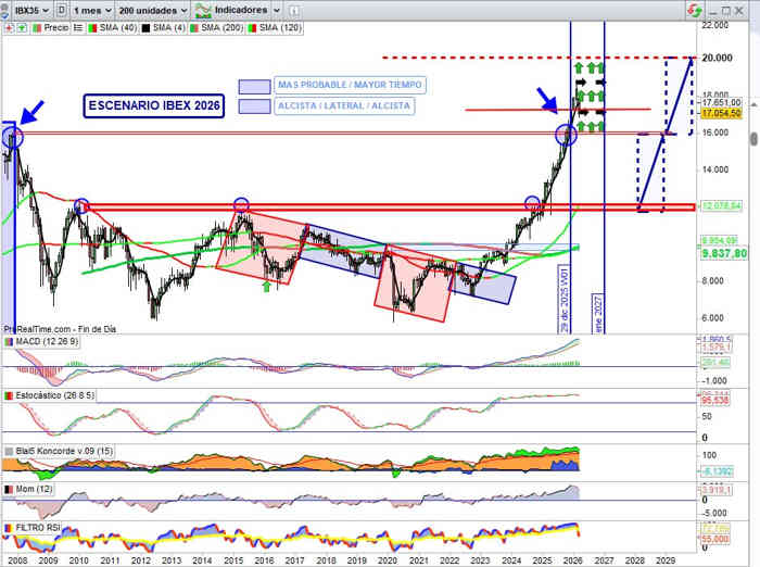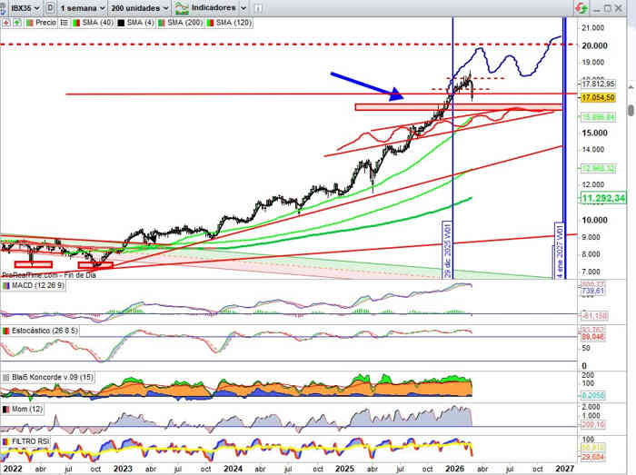 17.054 Puntos, -7,11% esta semana. Cierre semanal por tanto respetando los 17.000 Puntos, que en todo caso es solo una referencia psicológica. Sobre referencias técnicas tenemos ya lo siguiente en el escenario cisne negro el tiempo que dure con gráficos limpios ya sobre toda la estructura alcista en curso desde Enero de 2023 y sobre escenario planteado de cara a 2026 en adelante teniendo ya una zona concreta de máximos Históricos en los 18.360 Puntos, siendo estos en el pico alto del mes de estos máximos referenciados a los 18.573 Puntos.