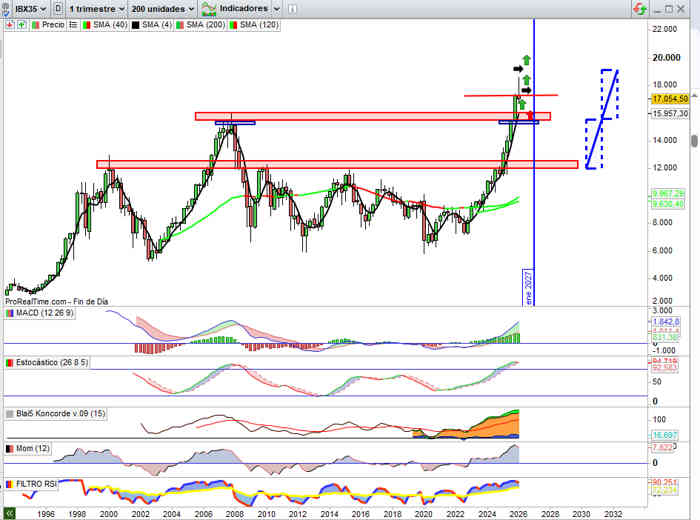 En esta vista mensual por tanto condición de la estructural en SEÑAL DE COMPRA GENERACIONAL al romper los máximos históricos en esta zona de los 16.000 Puntos siempre a respetar para mantener la condición alcista sin primer daño técnico con el selectivo español manteniendo activada todavía una primera zona objetivo de esta rotura de resistencia de los 16.000 Puntos en su momento hacia la cota entre los 20.000 y 20.100 Puntos.