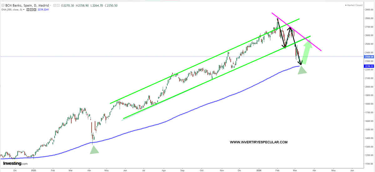 Porcentualmente la banca lo ha hecho peor que el IBEX dado que este sectorial español ha bajado un 19% en una corrección en tres a la EMA 200 perdiendo momento y canal alcista.