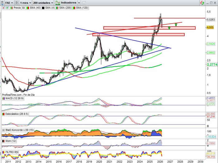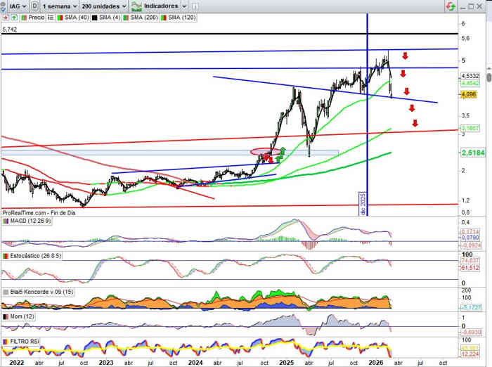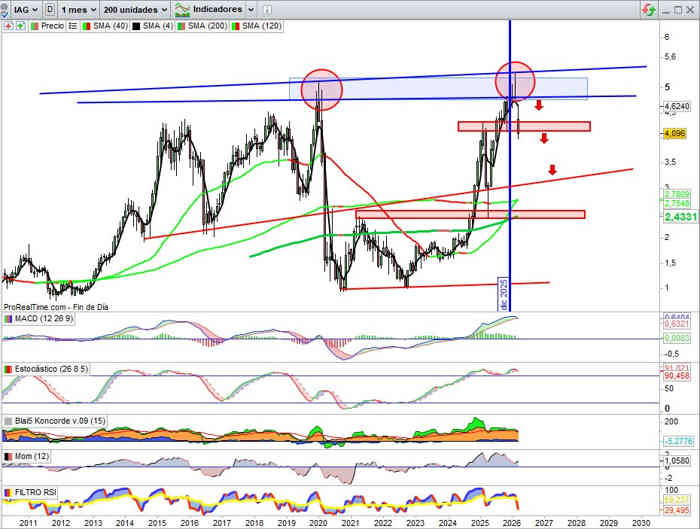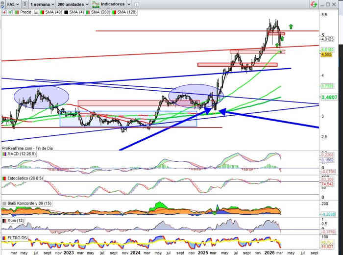 Sobre Gráfico Mensual, corrección de momento en lo que llevamos de mes del -12,40%, con el valor en zona que nos dirá si el escenario que activa esta semana gana en connotación correctiva o de consolidación, clave no perder aquí la zona soporte de los 4,40€ en rango en esta vista, y por arriba cierres por encima de los 4,60€ inicialmente, que consiga mantenerse en rango de momento alivio y reposo técnico, porque los indicadores siguen aquí en señal de compra y en favor de la tendencia.