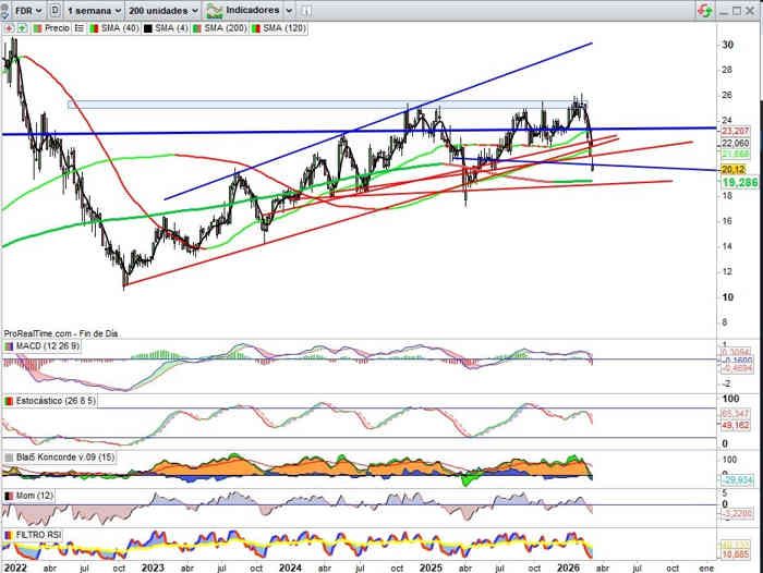 20,12€, -5,27% esta semana. Sin duda otro de los activos en niveles correctivos más representativos de valor afectado por el escenario geopolítico actual, ya previamente al inicio de este corrigiendo desde importante zona de resistencia clave, el valor se mantenía sobre un sólido soporte hasta la zona de los 21,30€, y se convierte ahora en una zona resistencia clave sobre la que ya hemos gestionado este activo, pendientes de la zona clave técnica ahora en actual escenario por la directriz alcista que pasa por la zona de los 19,30€, importante Media Móvil de 200 que pasa ahora por los 19,28€.