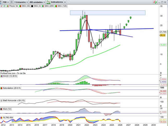 Cierre por encima de la zona entre los 20,40€ y 20,50€, de momento sería una buena señal mientras no consiga perforar en cuerpos de vela los ya referidos 23€ como zona clave, y aquí como en otros hasta confirmativo de plazo del Gráfico, todo abierto, sobre todo tratándose de este activo de tan alto potencial alcista.