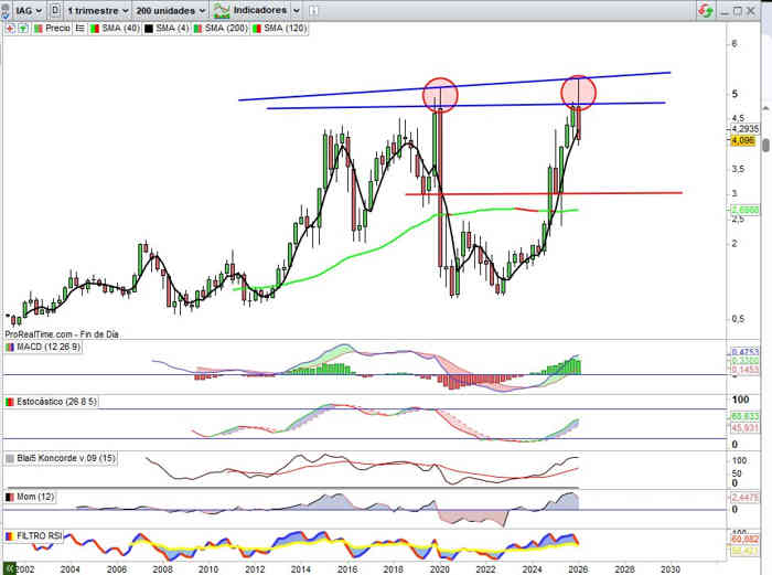 Sobre la referencia del petróleo, comentar que bajo mi punto de vista no le afecta solo en mayor medida el petróleo por encima de los 100$, pienso que el grado del movimiento bajista si se confirma desde la referencia actual lo marcaría el precio del PETROLEO desde los 80$, es decir, afectada IAG desde esos precios, mayor grado de implicación correctivo en lo que se refiere a la verticalidad probablemente de la corrección, mayor verticalidad cuanto mayor sea el precio del PETROLEO desde esos 80$, y menor verticalidad o brusquedad del retroceso cuanto más cerca de esta referencia, por mucho que pueda trasladar a los precios sobre los consumidores de sus vuelos y rutas, la competencia es brutal.
