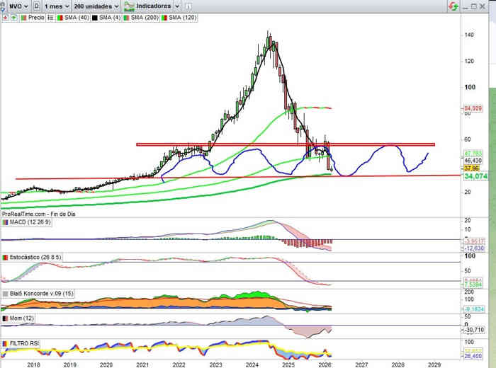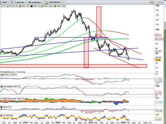 Y por arriba una posibilidad en actual escenario técnico sobre la que poder intentar cosas todavía en tendencia bajista, en el caso de que recupere la directriz bajista trazada en azul, la próxima semana referenciada a la zona 41$ y de momento solo para proyección a la gestión de la directriz bajista de la tendencia de medio plazo, en el caso de confirmación en ese movimiento, clave en la condición de la Media Móvil de 40 que ahora pasa por la zona de los 55$.