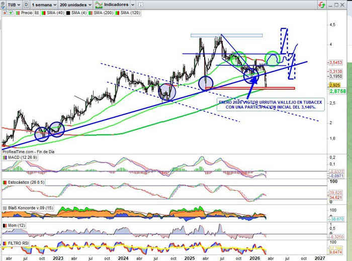 Clave por tanto esta referencia soporte en próximas semanas, porque si se pierde tendría motivos técnicos para pensar en este activo del orden de los 2,60€, atendiendo al desarrollo de su negocio, bajo mi punto de vista poco fundamentados, pero eso lo juzga el mercado.
