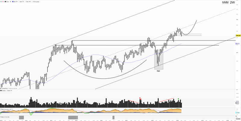 Tenemos una situación corto plazo compleja e interesante. El NASDAQ está más cerca de zona estructural clave, de los mínimos de noviembre, se adelantó a las correcciones y realmente estas semanas se ha sumergido en un rango lateral sin definir aún el rumbo. Estamos ante una distribución o una acumulación? Ambas de grado menor.