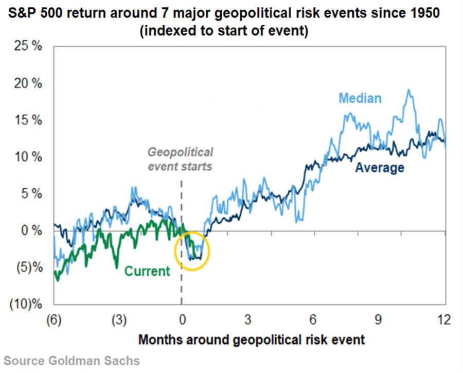 El gráfico inferior de Goldman Sachs ahonda en esta línea, mostrando el comportamiento medio positivo del índice tras siete de los mayores conflictos geopolíticos desde 1950: