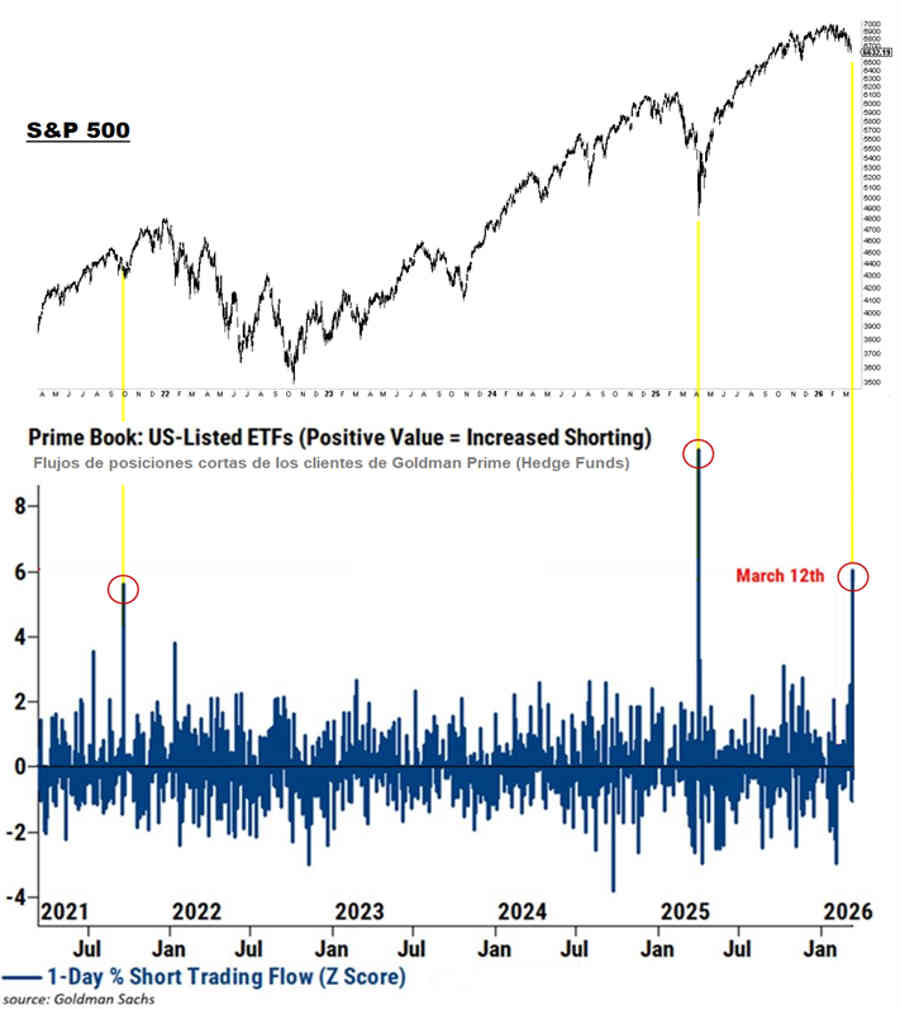 El gráfico inferior refuerza esta idea, mostrando el excesivo posicionamiento bajista de los clientes Goldman Prime (Hedge Funds) registrado el pasado jueves 12 de marzo.