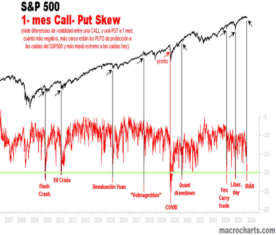 El gráfico inferior se relaciona con el anterior, mostrando el Call- Put Skew a 1 mes del SP500. Aquí se mide las diferencias de primas de volatilidad entre las calls (alcistas) y las puts (bajistas).