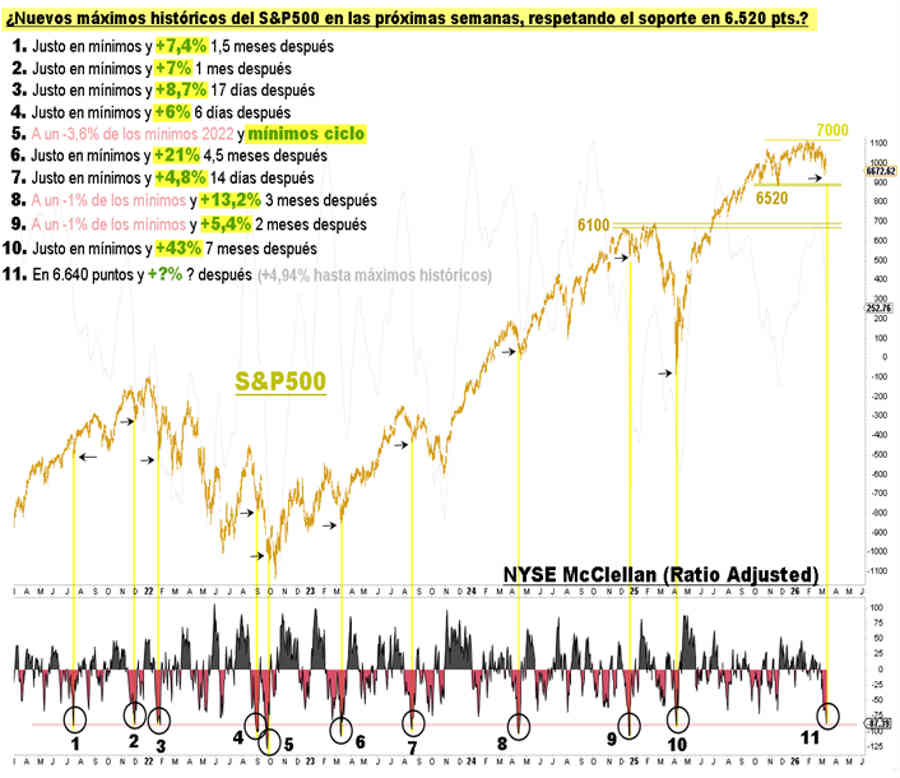 Como se aprecia, se trata de la tercera ocasión que estos fondos presentan lecturas tan elevadas, habiéndose asociado frecuentemente a puntos de rebote del SP500 semanas después: