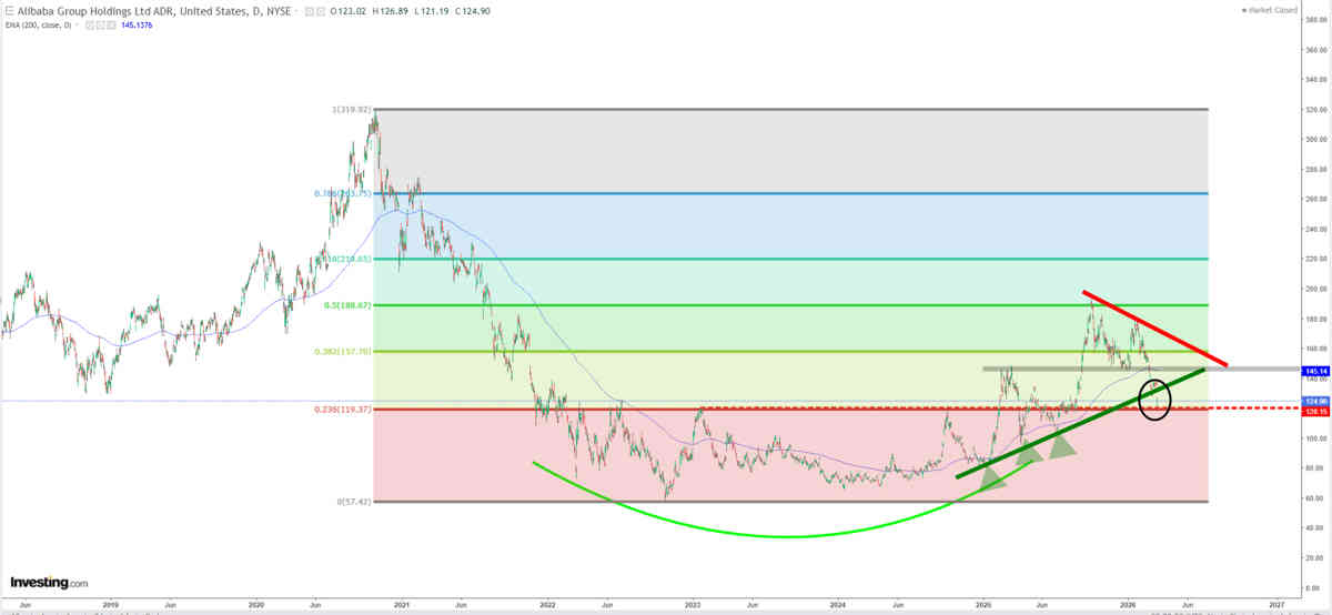 Bajo 120 usd nada bueno pasará en Alibaba, rotura muy fea la que ha hecho alejándose de la EMA 200 y la bajista de sus últimos máximos relativos.