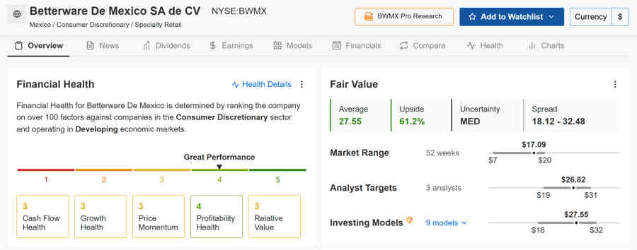 Lo que distingue a BWMX es su valoración: el precio actual de 17,09 dólares se sitúa muy por debajo tanto de su potencial de revalorización del 61,2% como del objetivo de subida del 74,5% de los analistas. Se trata de una combinación poco habitual de impulso y gran valor.