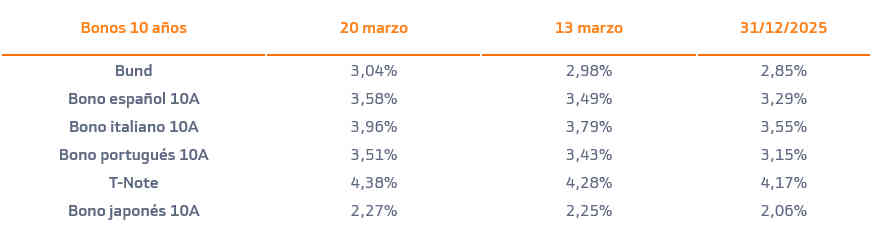 Análisis bonos. Los precios de la energía siguen siendo el factor director. Mientras no se relajen es improbable que lo hagan las TIR de los bonos. Un alargamiento del conflicto elevaría las perspectivas de inflación a largo plazo penalizando a los tramos largos de las curvas. En EE.UU., además, se sumaría a un mayor esfuerzo fiscal por el gasto militar.