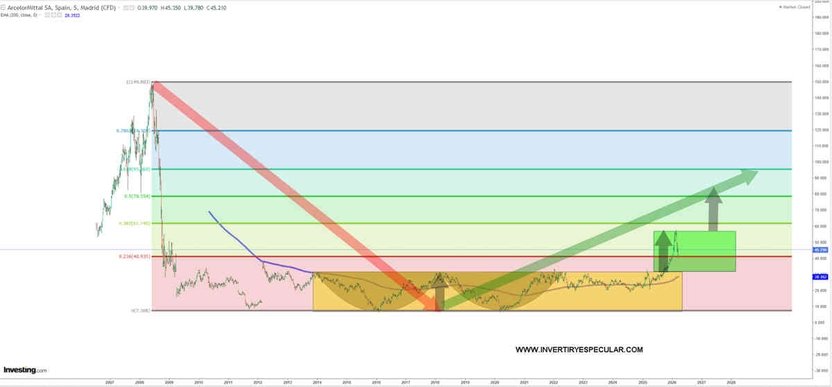 Vemos a ARCELORMITTAL (MTS:MC) cumplida de objetivo y estaría en modo throwback nos parece que por eso la retira de su cartera RENTA4 pero nos tememos que se equivoca, es una acción creemos que condenada a buscar el 61,8% de recuperación de su gran ciclo bajista desde sus máximos del 2008, el patrón de doble suelo es claro y de muy amplia base, de muchos años de formación que luego suelen ser los buenos.