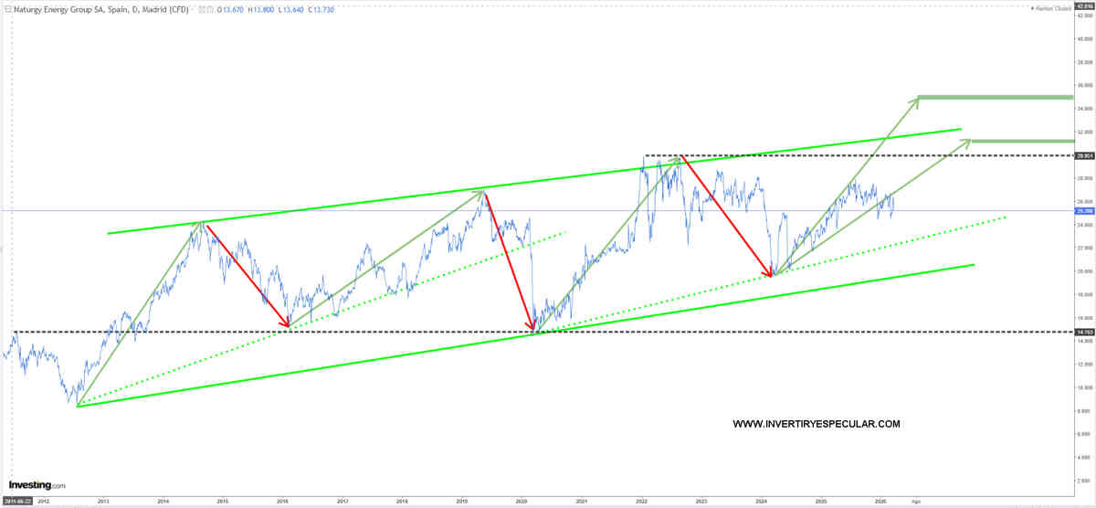 Vemos a NATURGY (NTGY:MC) técnicamente muy ordenada en el tiempo un flujo alcista del precio de forma moderada con impulsos y reacciones previsible, siendo así estaría a medio camino de sus objetivos: 31 euros y otro más alto incluso de 35 euros que imaginamos es lo que persigue RENTA 4 al meterla dentro de su cartera modelo, además mientras se espera como las otras cuatro pues dividendos contantes y sonantes.