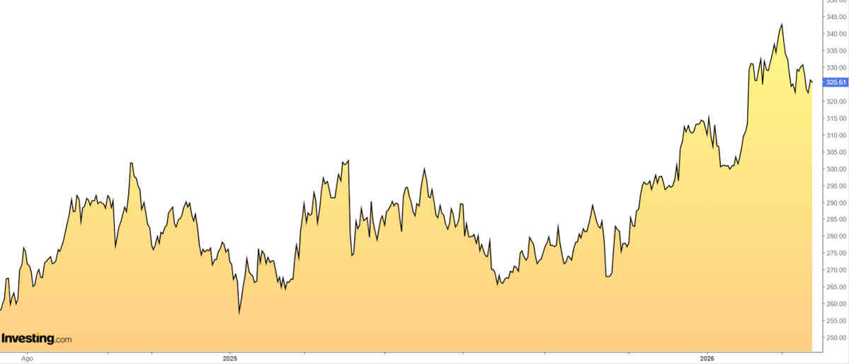 – Con datos del cierre del martes, cotiza con un descuento del 9% frente a su precio por fundamentales (354,94 dólares).