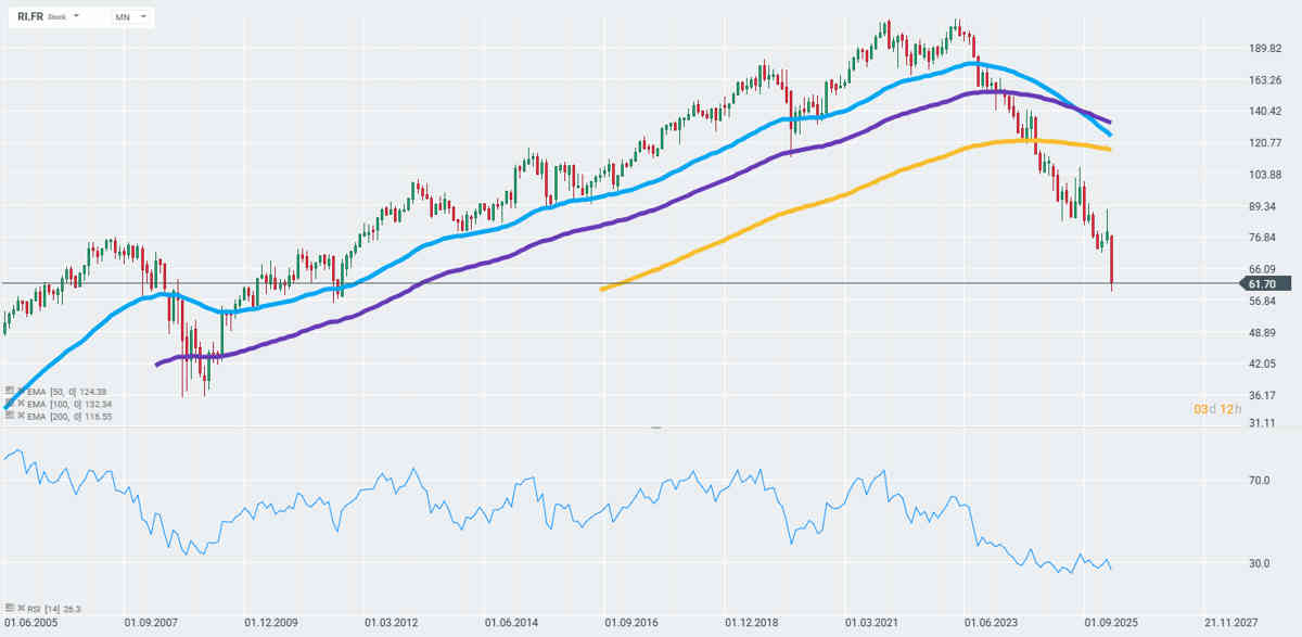 Pernod Ricard llega a estas negociaciones desde una posición de mercado significativamente debilitada. La compañía está valorada actualmente en unos 15.600 millones de euros, mientras que sus acciones han perdido casi tres cuartas partes de su valor desde su máximo de 2023. El PER se sitúa en solo 10,33x, el nivel más bajo desde 2009, con un precio por acción de 61,70 €.