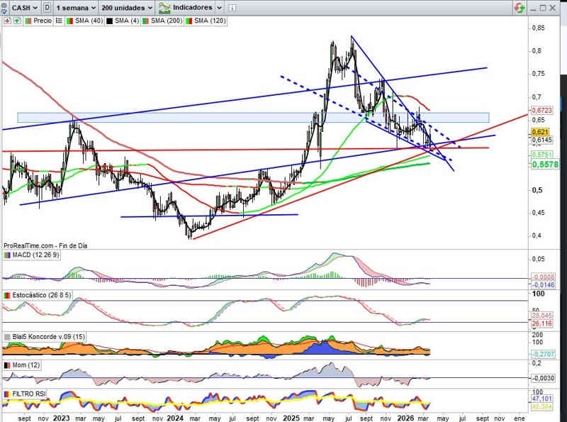 Y para despejar este escenario más conservador, por arriba, clave ver el valor perforando la resistencia de la directriz bajista que esta próxima semana pasaría por la zona de los 0,64€, pero sobre todo, confirmándola en perforación o metiéndose en el rango de la resistencia ahora entre los 0,6450€ y 0,67€.