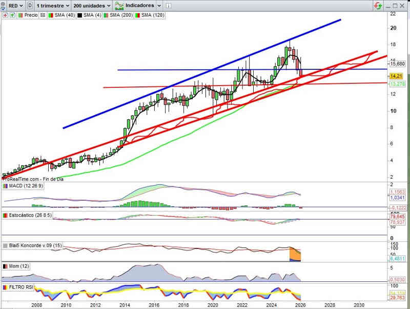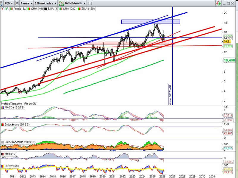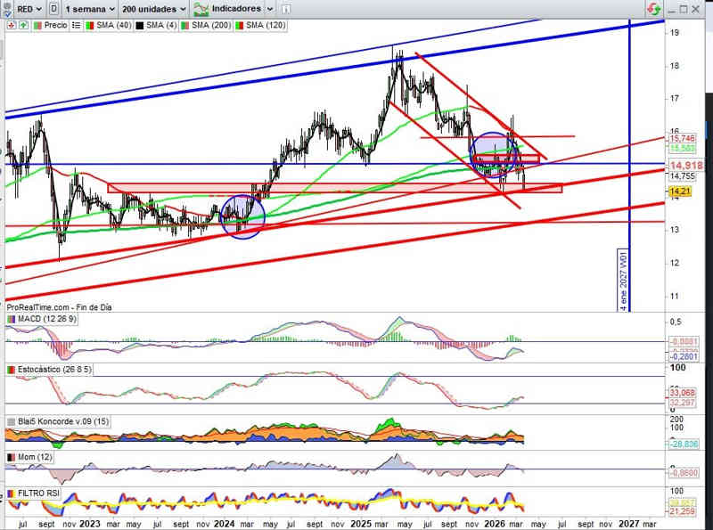 Los indicadores tampoco acompañan, y del tridente de las energías e infraestructuras, en este caso, el activo que peor lo está haciendo, sugiere técnicamente bajo mi punto vista seguir canal bajista para probar soportes inferiores, en este caso zona de la directriz alcista que pasa en este momento por los 13,30€, en todo caso, pendientes de confirmativos próxima semana sobre soporte que todavía mantiene actualmente.