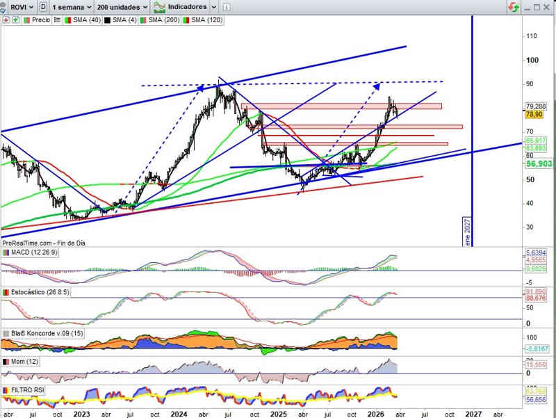 En esta vista semanal de ROVI el cierre es otra muestra de control de los valores en momentos determinantes, cierre por encima de la directriz soporte de tendencia alcista, que comentaba en anteriores que no me gustan estos como apoyos clave cuando muestran tanta verticalidad, pero si lo consigue, mejor, para descartar el apoyo o soporte inferior sobre la zona en el rango entre los 73€ y 71,50€.