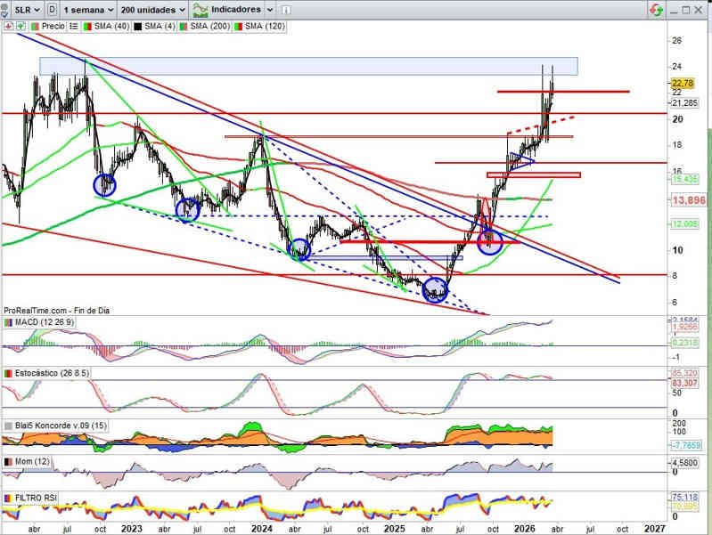 Cierres de semana por encima en todo caso de los 23,40€, activaría en cuerpo de vela señal de proyección hacia cotas mayores.