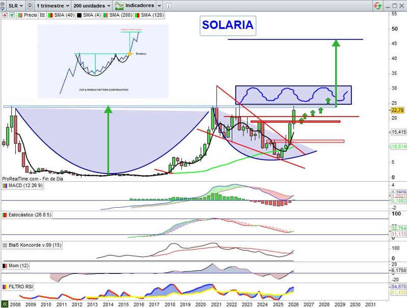 Sobre SOLARIA desarrollo de Taza con ASA que activa proyección inicial y creo que pronto la señal confirmativa del potencial que estamos hablando, en este activo a partir de la zona de los 23,60€ en cierres de Trimestre, como resistencia clave , para proyección de la figura hacia los máximos históricos del valor por la zona de los 31€, pero no solo eso, sobre el potencial en tesis planteada sobre el valor, hacia cotas objetivo técnico de los 46€ por acción.