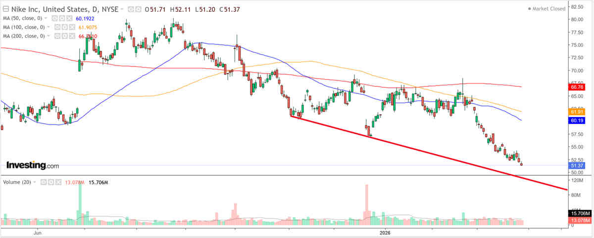 Las acciones de NKE cotizan justo por encima de su mínimo de 52 semanas, en 51,20 dólares, con una tendencia bajista implacable reforzada por una caída del 16,8 % en el último mes.