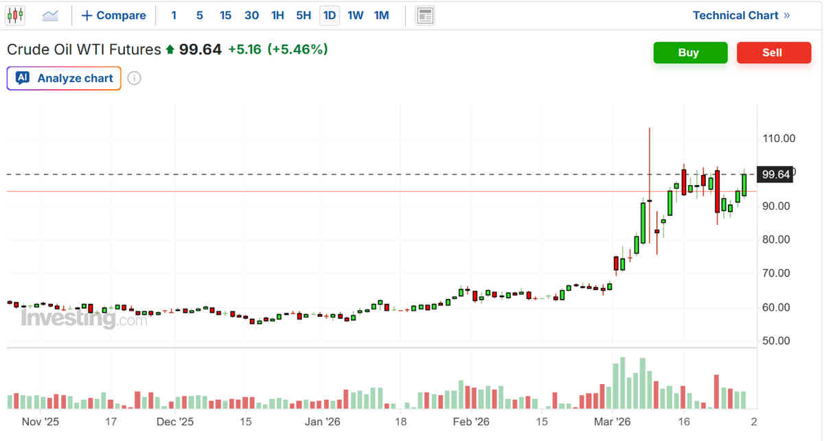 El crudo West Texas Intermediate (WTI) de EE. UU. ha subido más de un 70 % en lo que va de año, hasta situarse en unos 100 dólares por barril, mientras que los futuros internacionales del crudo Brent superaron los 105 dólares el viernes, con máximos intradía que se acercaban a los 110 dólares.