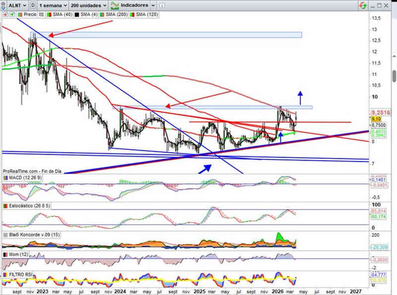 9,10€, +7,06% Ayer. Muchas noticias buenas catalizadoras alcistas del precio en el corto plazo ya anunciadas y que el valor no venía reflejando en el precio de cotización, la última el viernes que ya sería mucho manipulativo que el valor no reflejase, pero con cosas muy positivas en este sentido por delante en el corto plazo, lo que haga, en definitiva, nos importante en el corto / medio plazo en el desarrollo de su estructura y de la tesis planteada sobre el valor. Hoy tendremos cierre semanal / mensual, activo muy poco líquido en su negociación diaria / semanal, pero que no debiera ocultar su potencial actual en el desarrollo de la estrategia, yendo diversificado, un valor bajo mi punto de vista actualmente en sugerencia técnico / fundamental para acompañar otros activos en carteras.