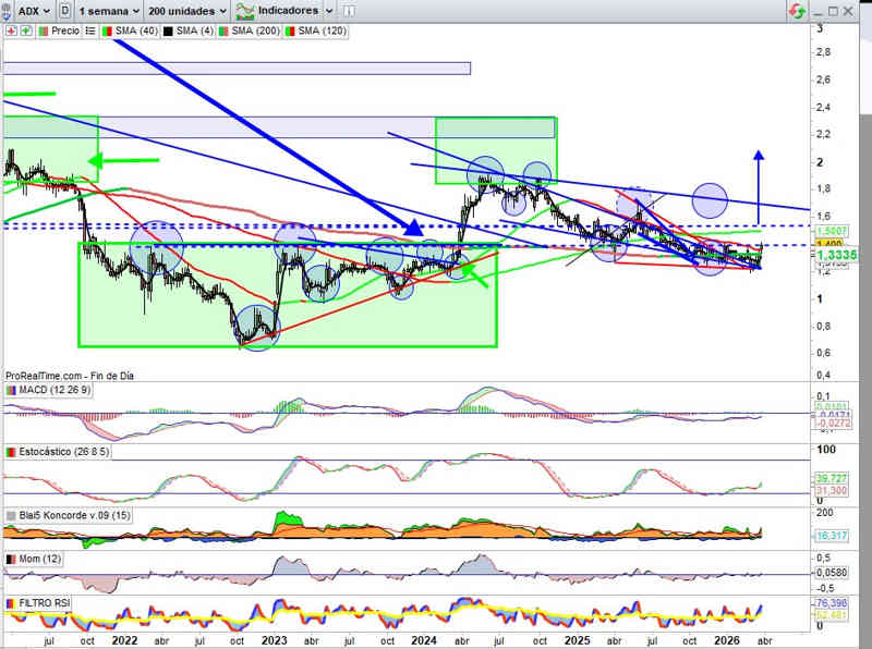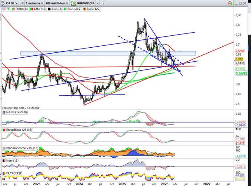 Se sitúa en precios de gestión de la resistencia por encima de la perforada estas dos semanas pasadas, previa Junta de Accionistas, clave por tanto su confirmación con la perforación de esta resistencia actual sobre lo visto en la actualización del fin de semana, zona 0,64€. Si a mayores vemos precios dentro del rango 0,65€ en cierres semanales, atentos al valor porque estaría señalizando a proyección de relanzamiento alcista tras fin de Consolidación técnica señalada. Cuña de Implicaciones Alcistas de gran potencial.